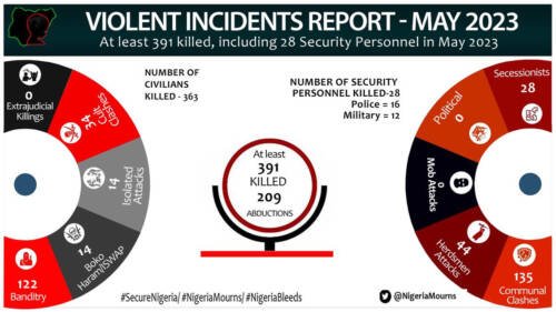 “Banditry which was previously recorded in the past years as the largest cause of violent deaths across the country contributed to the highest death toll again in April with 244 deaths while Herdsmen related activities mostly in the North Central part of the country recorded 209 casualties, followed by Communal Clashes that constitute of about 24 deaths.”